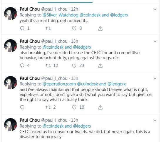 coindesk文章发出后,LedgerXCEOPaulChou随后在推特评论称CFTC此举是“反竞争行为”、控诉CFTC违反规则、这种行径完全背离民主原则等,还将对CFTC进行诉讼。同时,PaulChou表示已经和律师进行了洽谈。