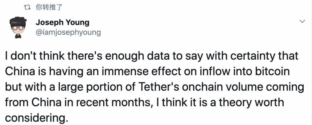 我不认为有足够的数据支持说中国对资金流入比特币产生了巨大的影响,但最近几个月,Tether很大一部分的链上交易量来自中国,我认为这是个值得思考的问题。