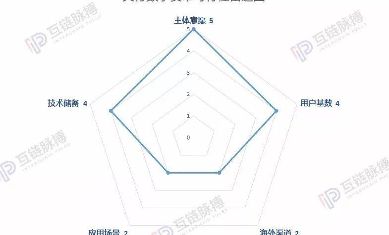 根据上述内容,互链脉搏从主体意愿、用户基础、海外渠道、应用场景、技术储备等几方面对央行数字货币进行了数据化的分析,并根据几方面的指数绘制了上图。