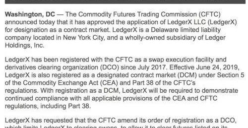 而LedgerX作为已受监管的合规期货合约交易所和清算所,早在2017年7月就已经在CFTC注册了掉期执行设施许可资质和DCO认证,LedgerX此前已经具备了为客户提供掉期合约和期权合约的资质。而在2018年11月LedgerX又向CFTC提出的合约市场DCM申请,已于今年的6月24日取得了DCM的许可资质。而背靠美国最大网络券商之一TDAmeritrade的ErisX交易所则是在2011年11月获得了DCM许可证,并于上月初获得了DCO许可证。