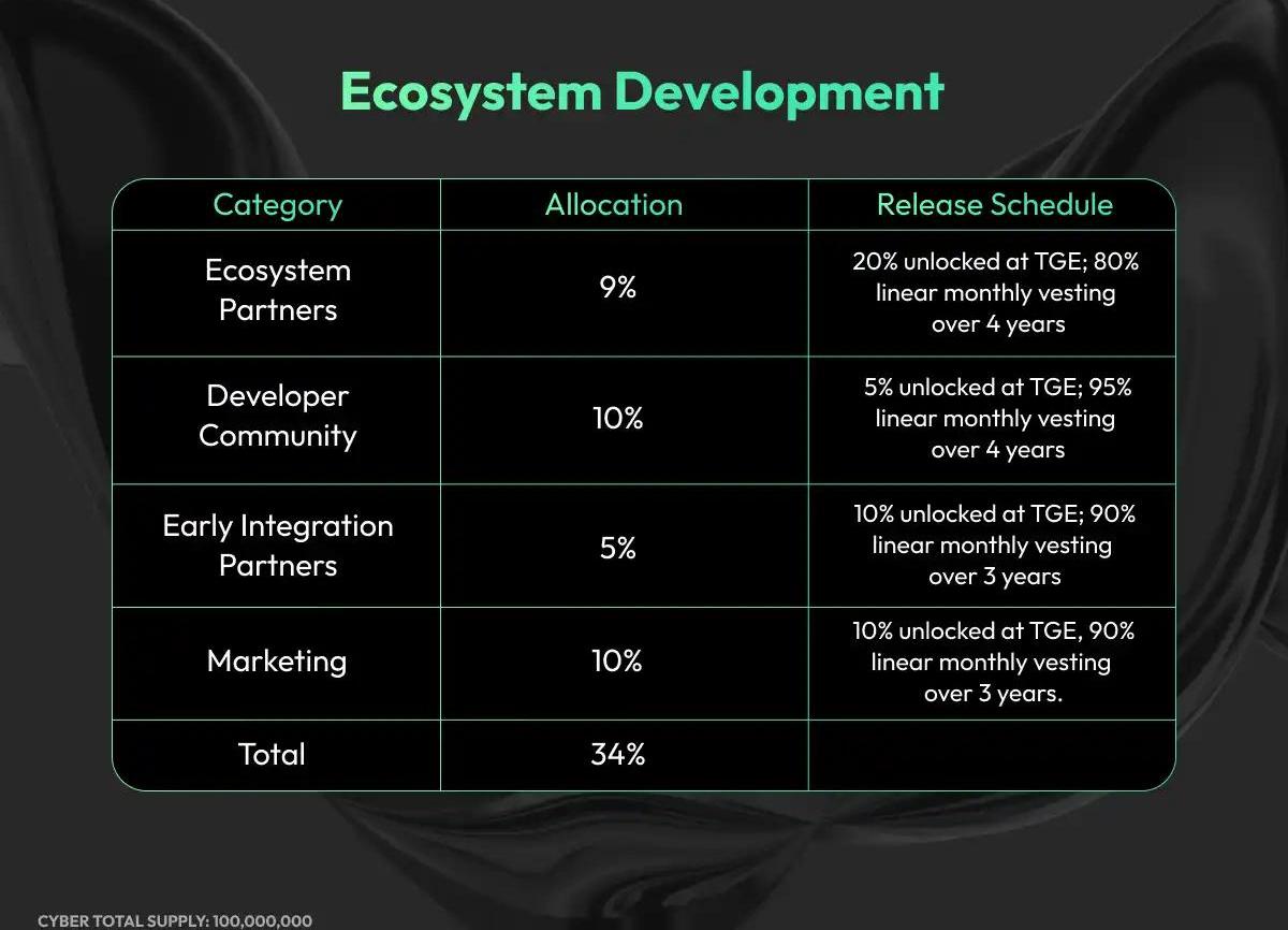CYBER总供应量为100,000,000枚,CoinList公开发行量占3%,其中25%上线后解锁,剩下75%在6个月内线性按月解锁。详细的分配如下: