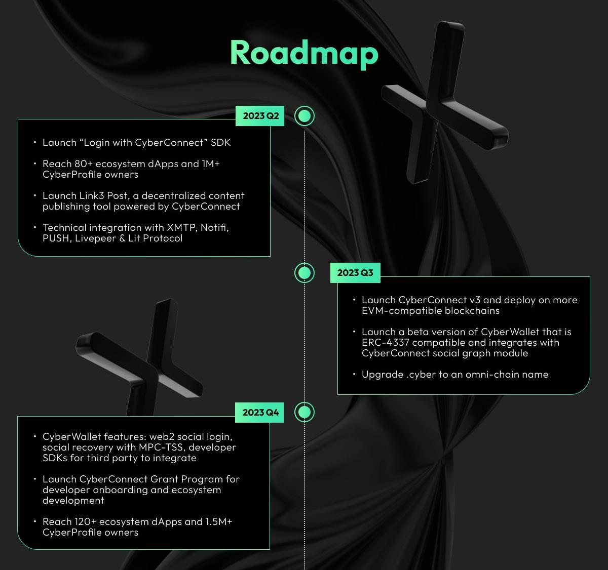 现在只是CyberConnect在web3构建社交网络的旅程的开始,将创建一个我们对数字生活拥有最终控制权的未来。根据其2023年路线图,在接下来的几个月里Cyber??Connect还将发布几项重要功能,包括在今年二季度推出「LoginwithCyberConnect」SDK和由CyberConnect提供的去中心化内容发布工具Link3Post;今年第三季度启动CyberConnectV3并部署在更多EVM兼容链上;发布支持ERC-4337的CyberWallet测试版;今年第四季度推出CyberConnect生态赠款基金等。