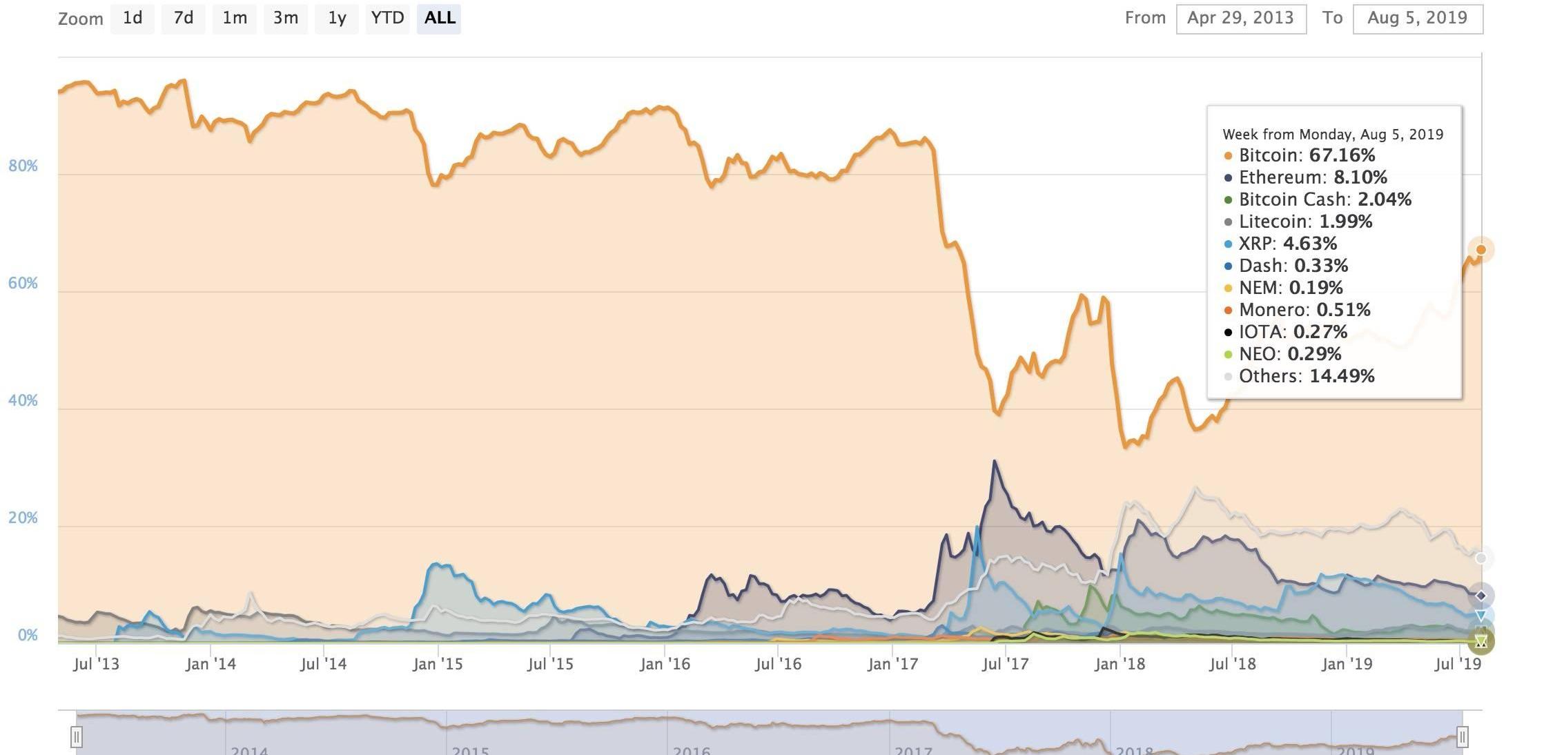 随着美联储降息、人民币破7等一系列重大事件的发生,黄金和比特币等资产的避险属性也越来越明显,本周一,比特币再次突破11500美元关口,而随之发生的,则是其市场占有率再次飙升,截至发稿时,BTCDominance指标已达到67.6%,距离70%的关键比例越来越近。
