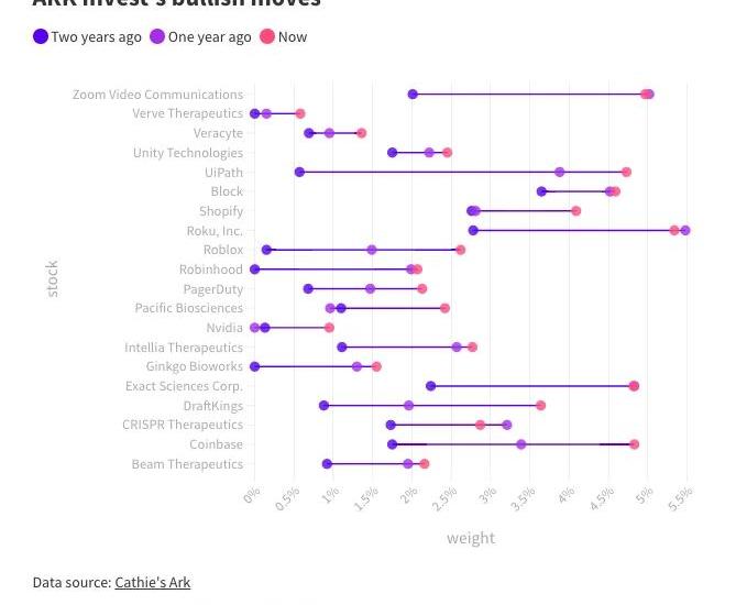 至于芯片制造商Nvidia,虽然随着以太坊成功转向?PoS,该公司与加密货币的相关性已大幅降低,但?ARKInvest?还是增加了对其的“持仓比重”,两年前该数据仅有0.13%?,现在则已上升至0.95%?。