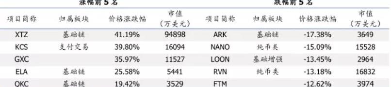 上周行情回顾:ChainextCSI100下降9.06%,细分板块中文娱社交类表现最优。从细分板块来看,纯币类板块表现略优于ChainextCSI100平均水平,为13.68%,支付交易,物联网&溯源,文娱社交,商业金融,基础增强,基础链,存储&计算和AI板块表现逊于ChainextCSI100平均水平,分别2.37%,-5.19%,0.85%,1.38%,3.05%,4.85%,-0.9%,0.85%。