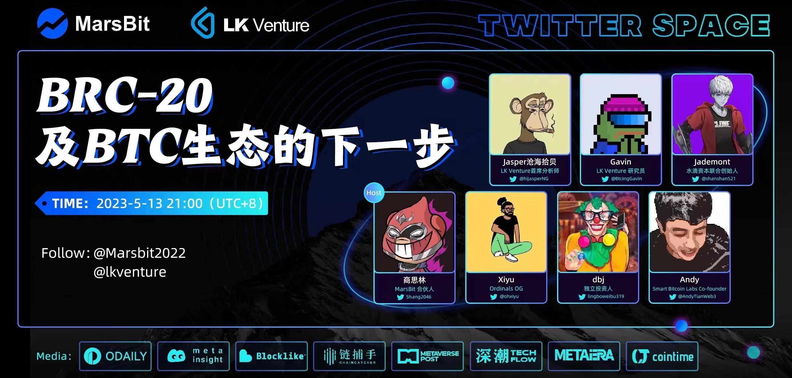 5月13日21时,LKVenture将联合MarsBit举办TwitterSpace活动,主题:「BRC-20及BTC生态的下一步」。