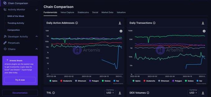 @Artemis__xyzArtemis是一个综合的数据分析平台,将所有重要的加密指标聚合在一个地方,跟踪提交和活跃的钱包/交易,深入了解开发人员对项目的活跃程度。该平台聚合了来自15条以上顶级链包Arb,Aptos,Sui,Op,Avax等的链上指标、以及来自开源存储库的开发人员指标以及基本指标