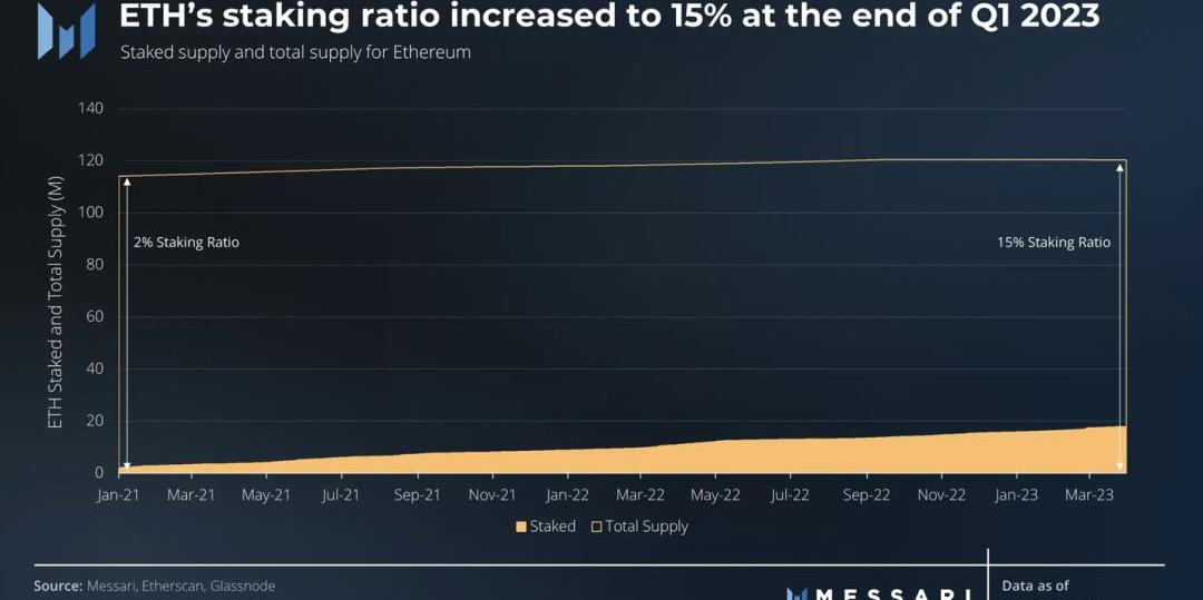 在本季度,由于诱人的实际收益,质押合约的流入强劲。本季度新增220万ETH质押,将质押供应量增加至1,800万。截至本季度末,以太坊的质押比例从本季度初的13%上升至15%。由于上海升级实现了从质押合约中提款,最近质押ETH的风险降低了。随着质押风险降低,未来几个季度质押ETH的数量应该会大幅增长。