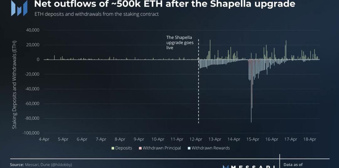 2023年4月13日,以太坊进行了上海/卡普拉升级,允许从质押合约中提取资金。自信标链启动以来,验证者累积的奖励将自动分发给他们,并在“已提取奖励”下显示。对于希望解除质押的验证者,可通过“全部提款”或“已提取本金”自愿退出。已经解除质押的以太币超过110万,其中80%是奖励,其余部分是全部提款。大部分全部提款是由Kraken完成的,因为作为与SEC达成和解的一部分,Kraken不得不关闭其面向美国账户的质押业务。