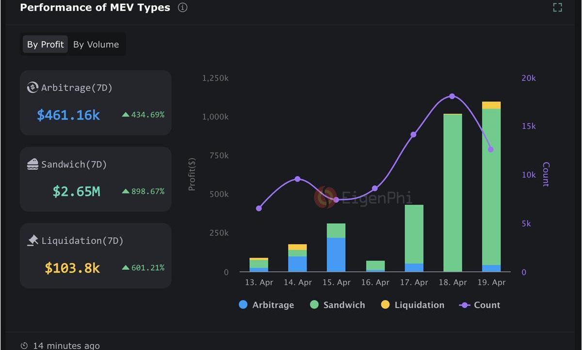 本质上,MEV促成了所有区块链使用者展开了对于区块空间使用权的争夺。因此,在链上回暖的当下,MEV成为了许多搜索者的“提款机”。比如,在Memecoin风潮下,截止4月19日,七天内MEV所产生的利润已经超过三百万美元。