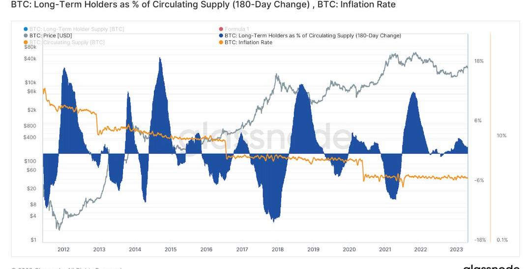 大饼市场周期中长期持有者的百分比变化也显示了大饼的分布,因为他们从持有超过六个月的人手中转移到新买家手上。