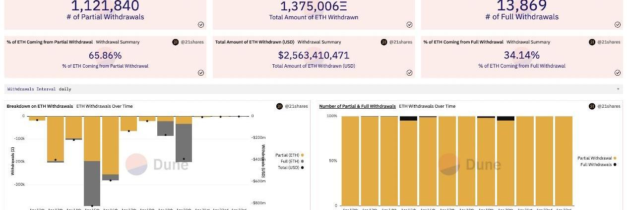 以太坊上海升级已过去10天有余,当前网络上究竟发生了什么变化呢?21Shares研究分析师TomWan用数据进行了解读分析,以下统计数据截至日期为4月22日。