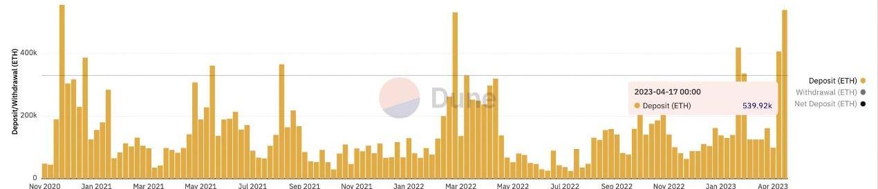 上海升级后,以太坊单周存款量达到了53.99万枚ETH,创下迄今为止第二大单周存款记录。流入量最大的单周存款记录发生在2020年11月23日那一周,当时存入了55.658万枚ETH。