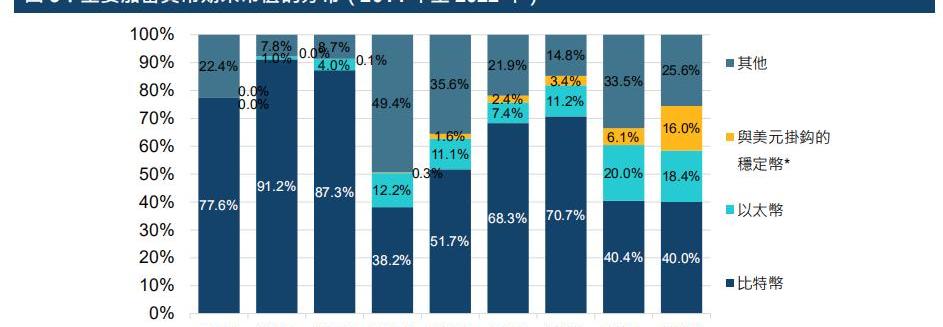 比特币、以太坊、稳定币和其他加密资产的市值结构变化: