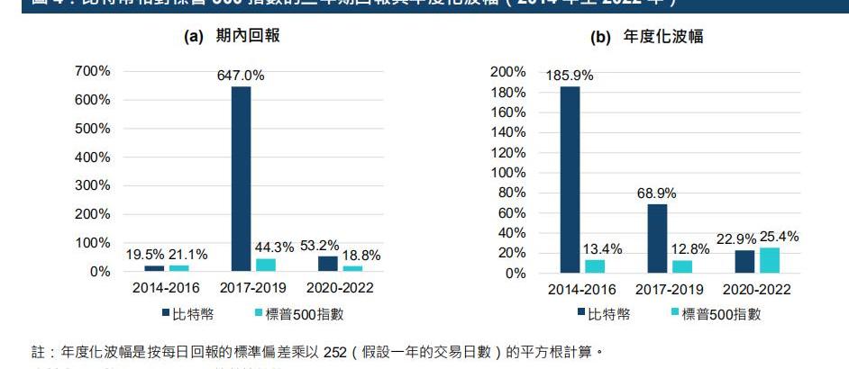 比特币的年度化价格波幅的高低位介乎2020年至2022年间的22.9%与2014年至2016年间的185.9%之间;标普500指数则介乎12.8%至25.4%;随着时间推移,比特币的年度化波幅有下行之势