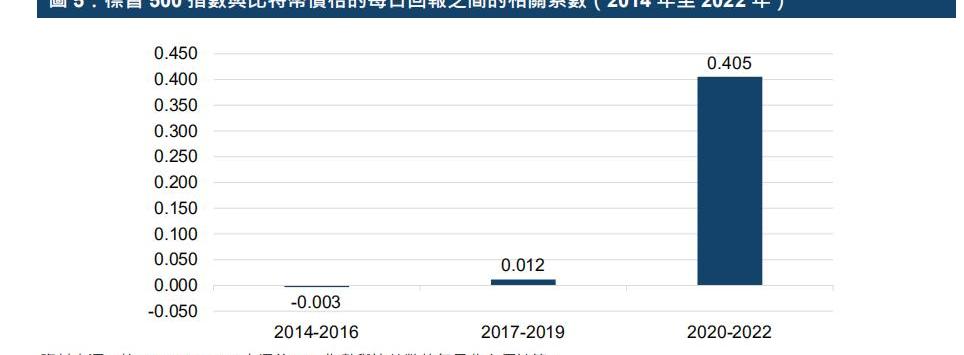 相关性可能随时间而变化:标普500指数与比特币价格的每日回报之间的相关系数由2017年至2019年间的0.012上升至2020年至2022年的0.405;可能因为传统金融机构对虚拟资产的投资逐渐加码,造成了相关性的增加。