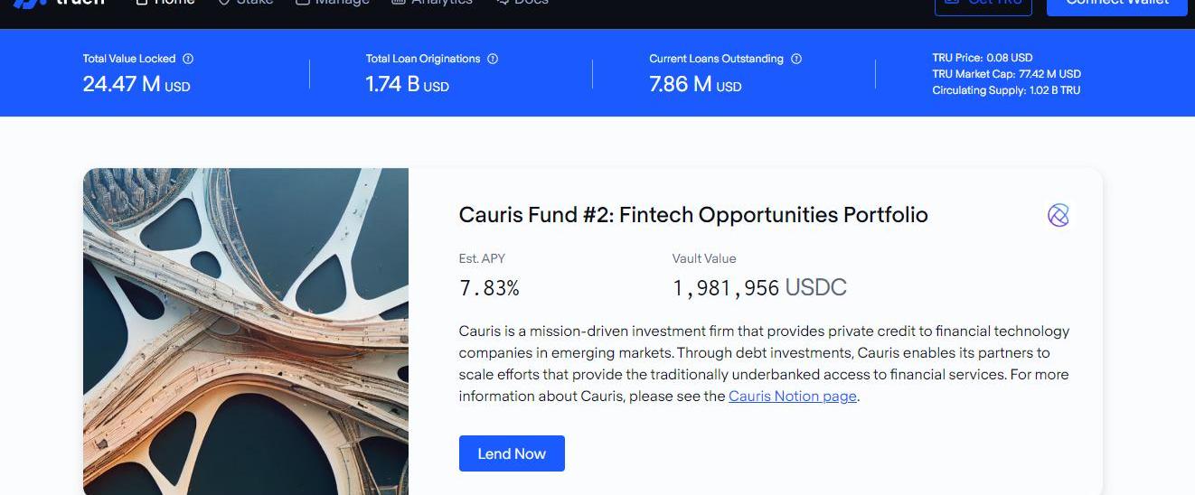 TrueFi是一个去中心化信贷协议,使机构能够以固定利率获得信贷,从而以资本高效的方式对其业务进行再投资。投资者可以将USDC/USDT/TUSD/BUSD选择对应的贷款资金池为其添加流动性,从而放贷生息赚取收益。TrueFi?现阶段主要聚焦在向加密原生的交易类投资机构提供稳定币的无抵押借贷服务,未来将逐步探索向公司和个人发放无抵押贷款。