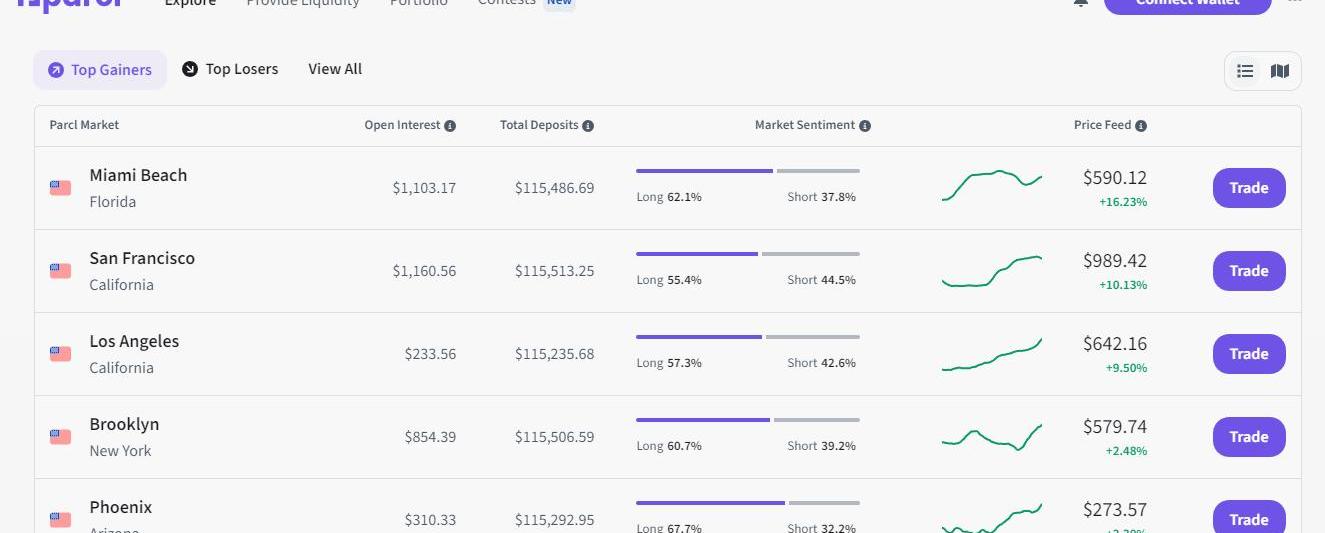 Parcl是一个专注于房地产的合成资产交易平台,提供了可投资于全球房地产市场的价格走势,用户可以浏览全球房地产市场,并根据他们认为房地产价值的涨跌来做多或做空。