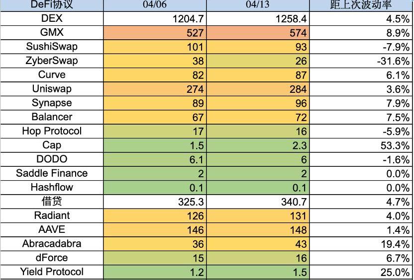 本周TVL总量上升4.3b。ETH链占比继续上升,相比上周增加~2%,从上周的59.15%上升到61.3%,近几个月的大趋势看eth生态的TVL也在稳定上升。从近七日的数据看,Optimism的TVL已经连续几周下跌,本周下跌0.69%,其他Layer2的公链都在继续上涨。Arbitrum上涨0.5%,Polygon上涨0.61%,、Avalanche上涨0.64%。