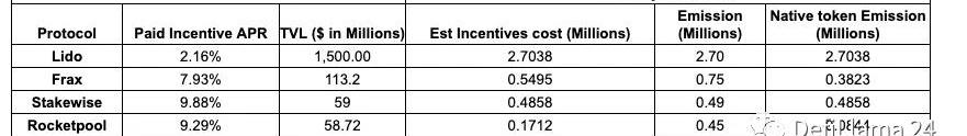 Frax每月使用54.95万美元来激励Curve流动资金池,同时发放75万美元的奖励,其中包括38.23万美元的FXS。虽然Rocketpool的原生代币发行效率稍高,但这是由于Aura的引导阶段。Frax将很快开始使用?Aura贿赂,减少FXS排放,因为目前对Aura的贿赂会产生更高的回报。因此,随着Balancer上流动性的增加,Frax可以减少对Votium的贿赂。