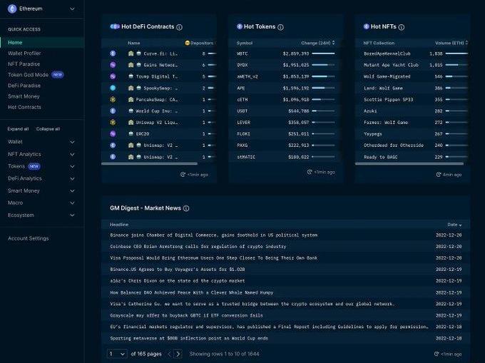 免费功能有热门代币、热门合约、热门NFT和市场新闻等,可以监控过去24小时内最活跃的DeFi合约、代币或NFT,对于我们寻找Alpha来说已经够了。
