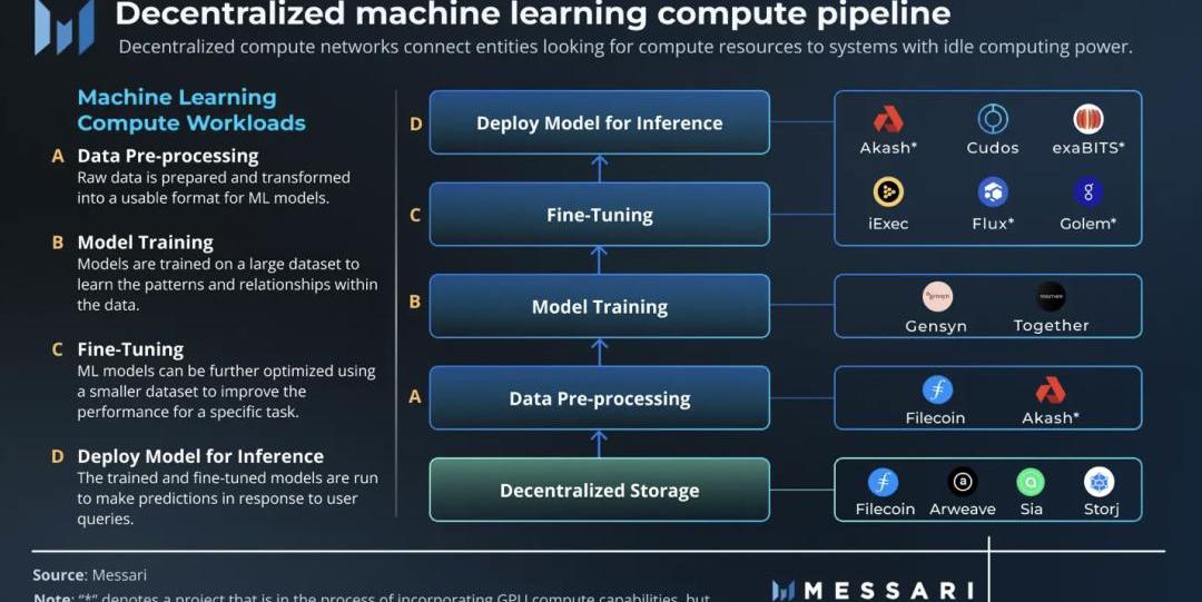 数据预处理:准备原始数据并将其转换为ML模型可用的格式,这通常涉及数据清理和规范化等活动。训练:机器学习模型在大型数据集上进行训练,以学习数据中的模式和关系。在训练期间,调整模型的参数和权重以最小化误差。微调:可以使用较小的数据集进一步优化ML模型,以提高特定任务的性能。推理:运行经过训练和微调的模型以响应用户查询进行预测。数据预处理、微调和推理工作负载非常适合在Akash、Cudos或iExec等去中心化云平台上运行。然而,去中心化存储网络Filecoin由于其最近的升级而特别适合数据预处理,从而启用了Filecoin虚拟机。FVM升级可以对存储在网络上的数据进行计算,为已经使用它进行数据存储的实体提供更高效的解决方案。