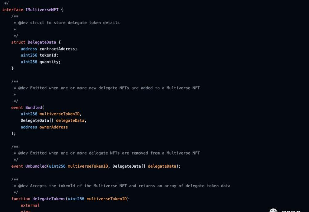 EIP-5606定义了一个接口为数字资产创建一个MultiverseNFT标准,同时可以索引这种资产在每个平台上的委托的NFT。这些平台可以是metaverses,Gamefi或NFT市场。该标准还允许在多元宇宙NFT中对这些委托NFT进行"捆绑"和"解绑",因此持有者可以单独或作为捆绑物进行交易。主要代码如下图所示: