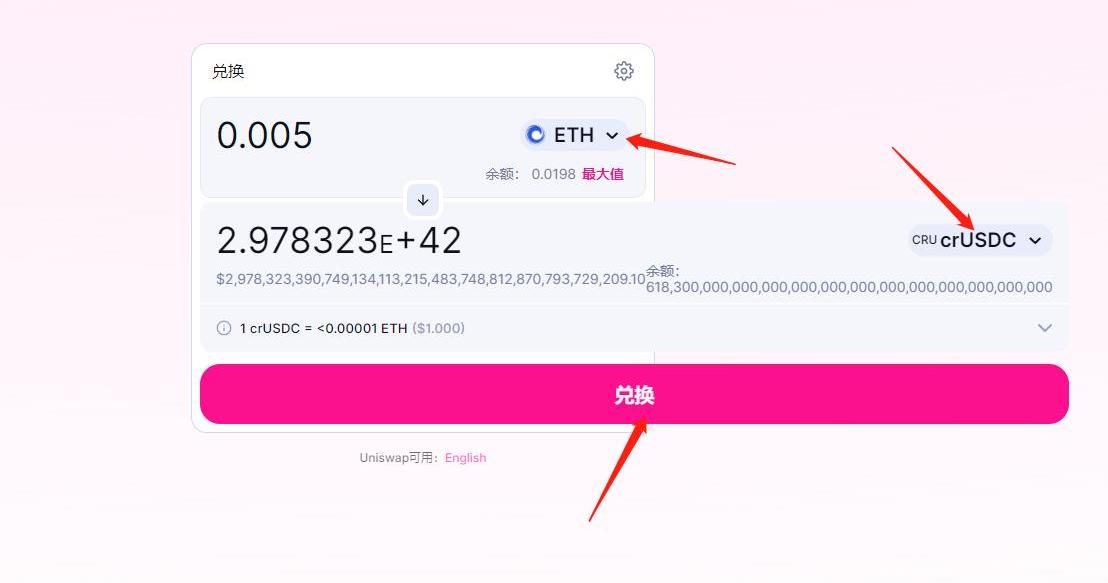4-2我们用ETH兑换crUSDC,输入金额,点击兑换