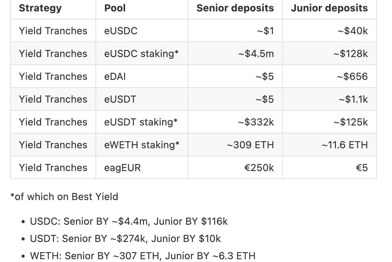 IdleFinance称,BestYieldVault和YieldTranches对EulerFinance的敞口分别为532.71万美元和566.28万美元,共计约1099万美元。