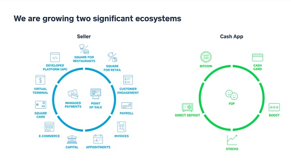 Square提供了两套完整的产品生态,一套是他们的Seller Ecosysterm(卖家生态系统),面向中小零售商提供支付服务,一套是Cash App生态,以P2P支付为核心,提供了包括比特币在内的多种服务。