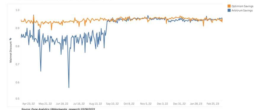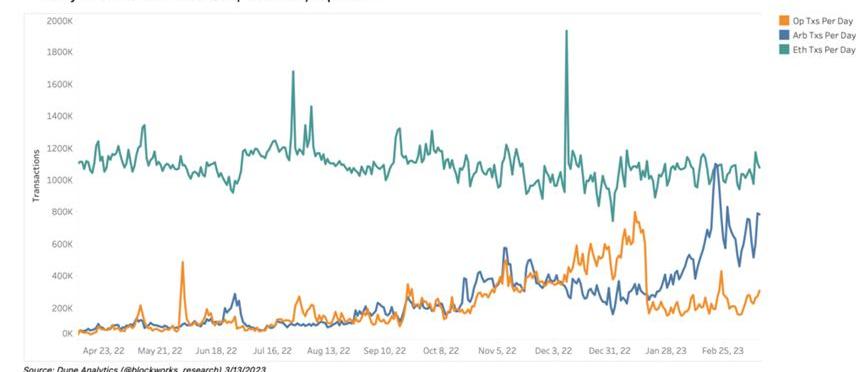 预计在2023年底,EIP-4844将大大增强以太坊上L2的扩展能力。这次升级将引入一个新的交易类型,’Blobs’,使呼叫数据进一步压缩,最终发布在以太坊的数据可用性层。最终用户将主要受益于交易费用的减少。值得注意的是,EIP-4844预计将在一定程度上与zkEVM的发展相吻合,因为众多公司和协议旨在加入Optimism和Arbitrum的L2空间,成为完全成熟的零知识rollup.2023年Arbitrrum的核心问题仍然是一样的,但变得更加紧迫:他们是否会继续在以太坊Layer2中提供有竞争力的交易成本?