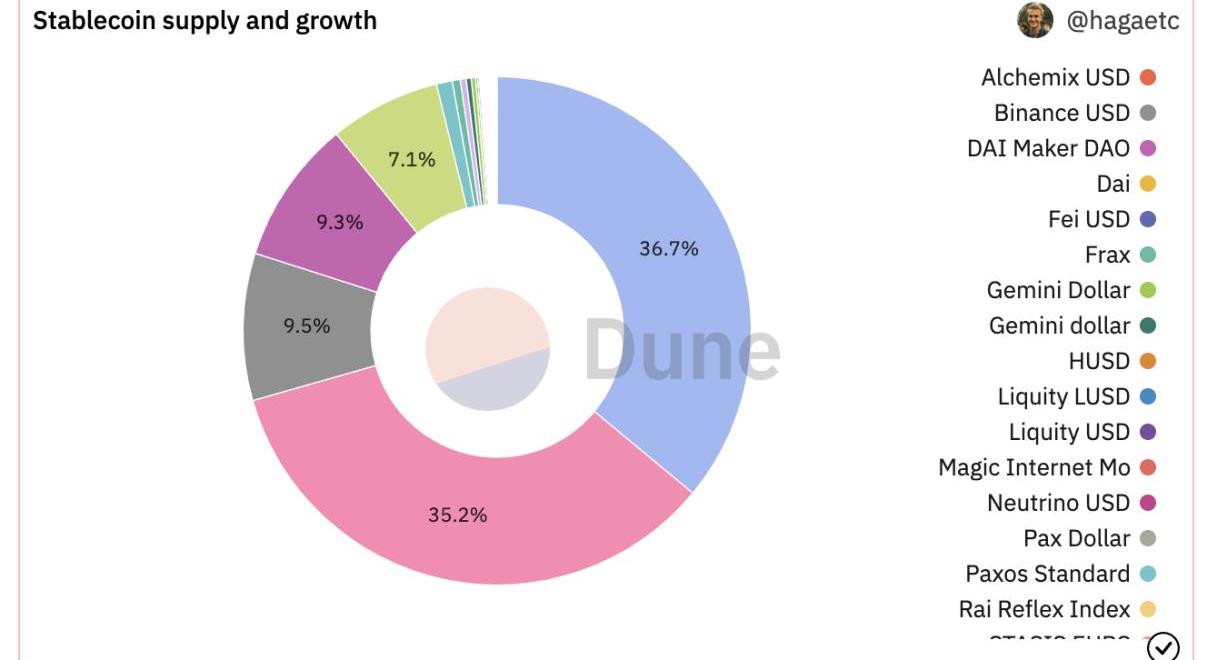 据dune数据,目前在稳定币赛道,占据主导地位的依旧是法币稳定币。