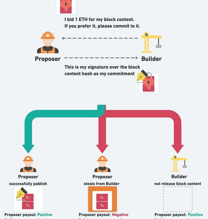 Builder的区块内容需要被保护,不能直接揭露Proposer如果偷走Builder的区块内容,他必须要付出代价Builder如果没有公佈区块内容,他必须要付出代价综合第1,2点,Proposer必须要先对Builder的区块内容进行承诺,然后Builder才揭露实际的区块内容。如果Proposer违反承诺,改为propose其他区块内容,则他会被惩罚:他的押金被部分没收而且他propose的区块内容无效,也就是收不到该区块内容的手续费及MEV。这也是目前mev-boost有的惩罚机制。