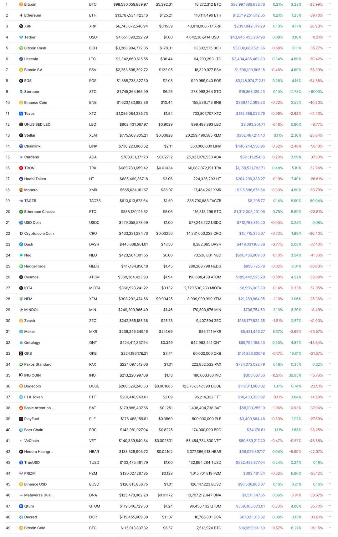 1.首先我们来看一下,2020年3月15日,加密货币市场,前100的币种。再来看看2021年11月8日,市场巅峰时刻,加密货币市场,前100的币种。其中大家还认识多少?