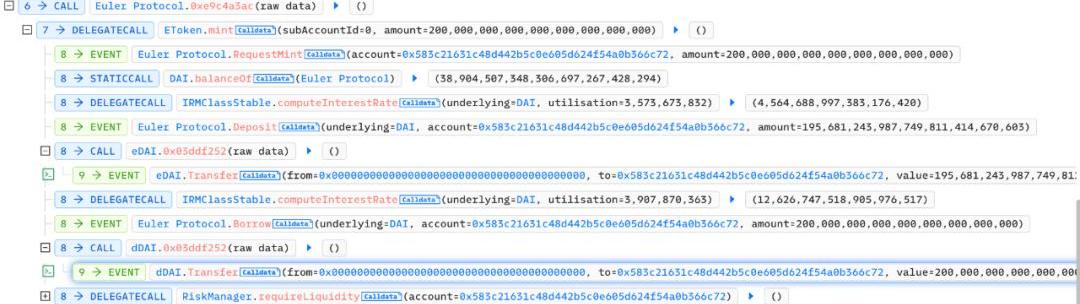3.之后调用mint函数(selfborrow)进行借款,借出了195,681,243枚eDAI和200,000,000枚债务代币dDAI。