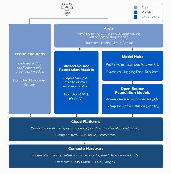 目前,在生成式AI领域似乎没有任何系统的护城河。作为简单的近似归因,应用程序因使用相似的模型而使产品缺乏过硬的差异化;模型也面临长远来看差异化不明确的问题,因为它们在相似的数据集上用相似的架构进行训练的;云服务提供商缺乏深层次的技术差异化,因为他们运行相同的GPU。