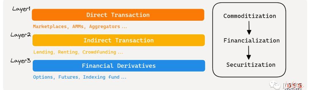 从直接交易到间接交易再到金融衍生,这三个层面的演进也正是NFT从商品化,到金融化,再到证券化,一步一步金融深化的体现。