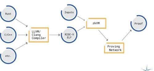对于RISC零,开发人员编写Rust或C++。然后系统将编译期间生成的ELF文件用作VM电路的输入代码。开发人员只需调用prove即可返回收据对象,任何人都可以从任何地方调用“verify”。从开发人员的角度来看,无需了解zk的工作原理,底层系统会处理所有这些复杂性。