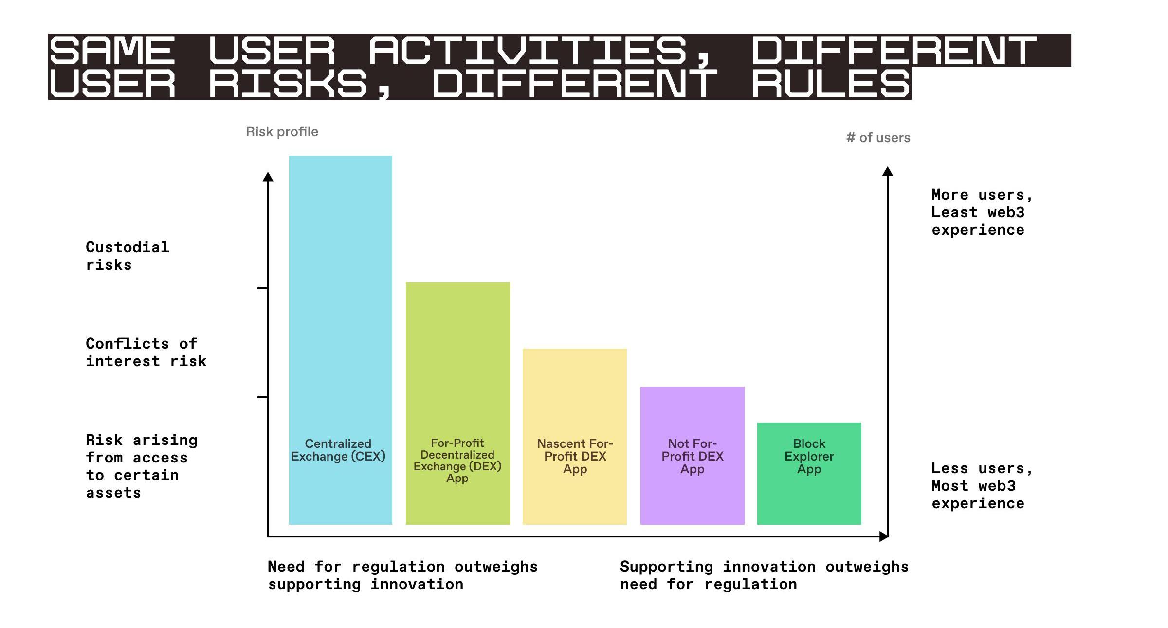 在本系列的第四部分中,我们展示了该框架如何在实践中应用于假设的市场结构监管。我们首先定义假设法规的范围,然后解释法规的不同规则和要求如何适用于web3领域中不同类型的参与者和应用程序。这一分析表明,为什么监管中最严格的要求应该适用于对用户带来最大风险的应用程序,而那些风险最小的应用程序应该受到较少的监管。这种风险加权方法确保了消费者得到保护,同时也保护了创新。
