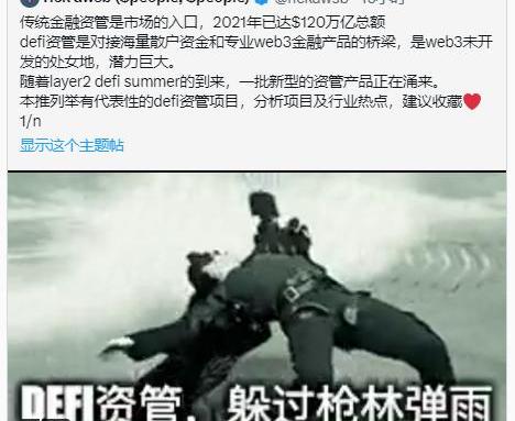 defi资管是对接海量散户资金和专业web3金融产品的桥梁,是web3未开发的处女地,潜力巨大。