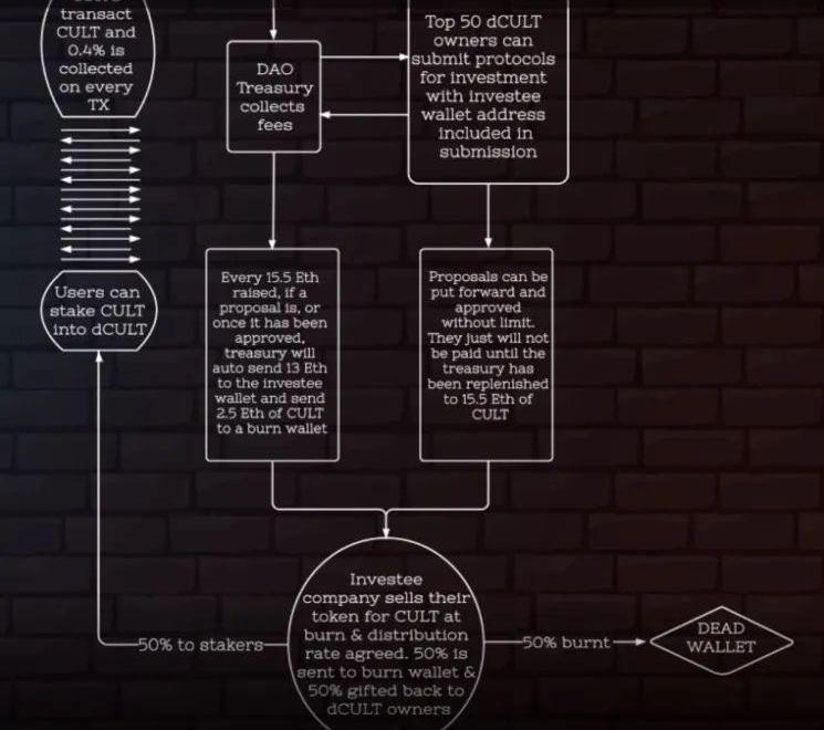 用户交易$cult时需缴纳0.4%的税款。这些税款自动进入国库。每当国库积攒到价值为15.5ETH的$cult时,就会将其中价值13E的$cult用于投资提案,余下价值2.5E的$cult则被自动销毁,从而实现通缩。DAO投资其他提案时,所投资的提案需在一定时期内将一定比例的所发代币兑换成$cult,兑换的$cult中有一半奖励给$dcult持有者,另一半将被销毁。