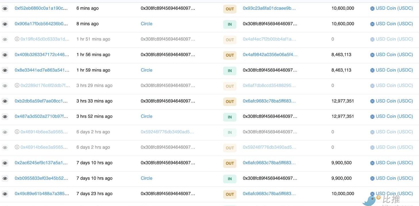 2月1日之后,主流加密资产开始出现回落,但该神秘基金并没有随着BTC和ETH的下跌而停止向加密市场注资。自2月10日以来,其地址“0x308F”已从Circle提取了1.55亿美元的USDC,并转移到交易所。而且这只神秘基金似乎还通过另一个地址“0xad6e”从#Circle中提取了3.97亿美元的$USDC,并自2月10日起转移到交易所。因为地址“0x308F”和“0xad6e”通过相同地址将$USDC转入交易所。