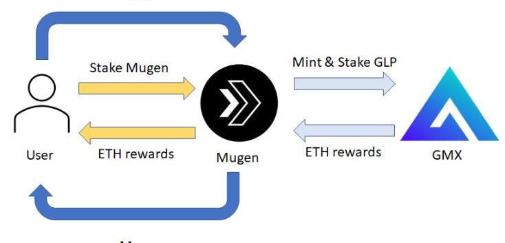 GLP策略由Mugen的金库根据该策略的白名单资金数量执行,金库则通过铸造和质押GLP获得收益。将资金存入Mugen的用户将铸造原生代币MGN,以xMugen的形式质押的Mugen将从国库中获得ETH收益。用户可以选择收益自动复投,将ETH收益用于购买MGN并抵押。这有助于提高APY,因为与手动复投相比,自动复投的频率更高。