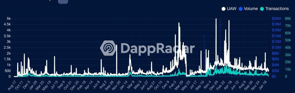 然而,随着加密市场走熊以及元宇宙热度褪去热潮,Decentraland的交易活动也开始大幅放缓,人气遭遇滑铁卢。DappRadar数据显示,截至2月22日最新数据,Decentraland每日唯一活跃钱包数量,即DApp交互的活跃用户数仅为422,交易笔数为883笔,成交量约为1700美元,智能合约资产余额为2702万美元。而在2021年末,Decentraland的日活跃用户数最高超1.38万,日交易量超5万美元,远超其过去一个月其用户和交易总数。过去30天,Decentraland的用户数约为5860人,交易笔数为8.6万笔,成交量为7.5万美元。