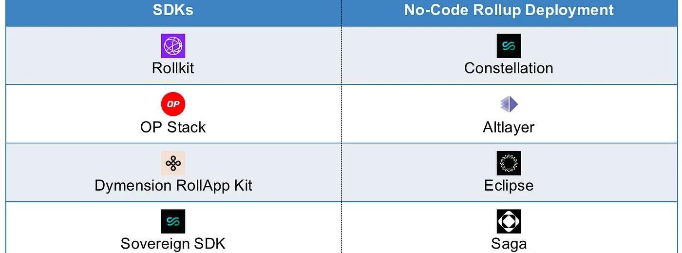 大多数RaaS项目都在使用这些SDK来开发用户友好且易于使用的无代码Rollup部署解决方案。RollupsasaService(RaaS)市场一直在快速增长,并且出现了多种SDK来满足开发者的需求。这些SDK提供了一系列功能和选项来简化部署Rollup的过程,包括对执行和结算的完全控制、将网络标准化为不同的层、与各种虚拟机的兼容性以及简化zk-rollup的创建。