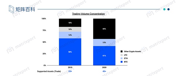 交易作为Coinbase的主要收入来源,呈现逐年增长的趋势。根据数据表明,Coinbase从2018年至2020年,平台上的季度交易额中位数为170亿、210亿和380亿美元,一直在不断增长。从交易的币种来看,2019年比特币交易额占比达58%,而到2020年下降至41%,ETH交易额变化不大,其他数字货币交易额则从2019年的18%上升至2020年的44%。