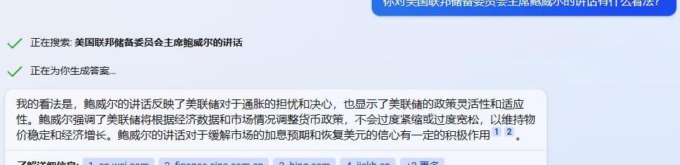 从回答可以看出,它列出的新闻是“还热乎”的那种,并且,它会根据回答中“美联储主席鲍威尔讲话”这件事,推荐我们继续问:“你对鲍威尔的讲话有什么看法?”。