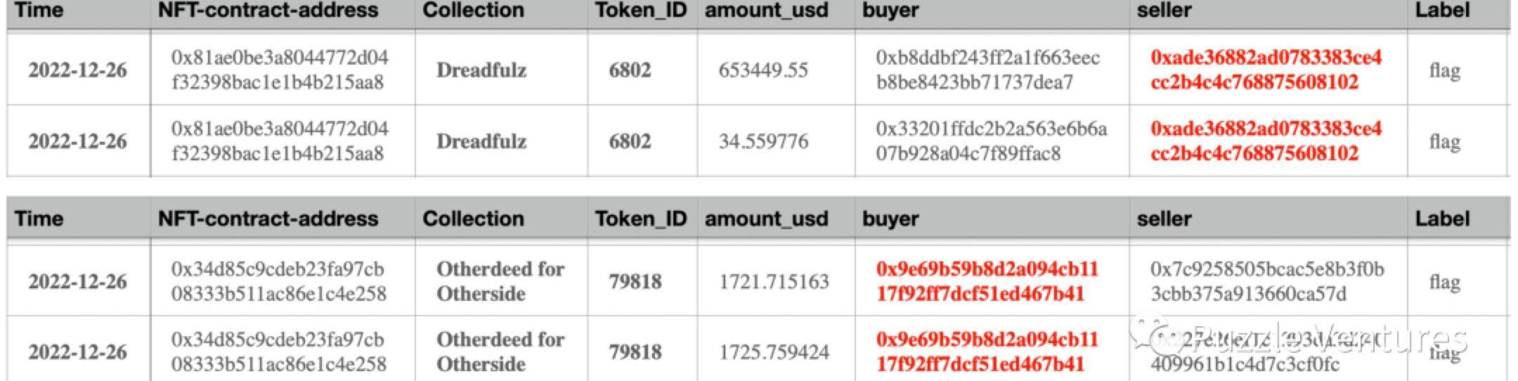 对于Dreadfulz(tokenID:6802)来说,两次交易的卖家都是一个人;对于OtherdeedforOtherside(tokenID:79818)来说,两次交易的买家都是一个人。
