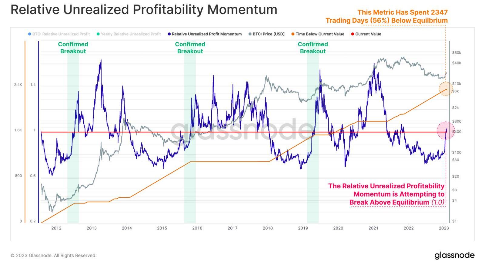 最近价格走势的飙升,已经超过了几个聚合的链上成本基础模型,导致市场财务状况显着改善。这一动量指标目前正接近均衡转折点,与2015年和2018年熊市的复苏情况相似。