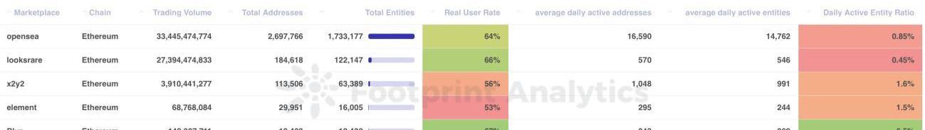 从图中可以看到整个NFT市场的真实用户比例其实不高,平均每个用户都大致使用了至少2个地址进行交互。其中X2Y2(56%)以及Element(53%)的真实用户比例最低,这可能是因为项目方的交易量活动导致大批量的女巫参与,造成的一种虚假繁荣景象。?